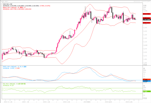 技术层面,日线级别图上,金价仍承压于布林带通道中轨线之下,短线金价仍偏向震荡下行。技术指标MACD信号线交织指向性仍不明朗。当前需留意6月18日低点2306.48美元附近支撑,然后是2300美元整数关口支撑,如果金价失守2300美元关口,将进一步考验宽幅震荡区间的低部区域2284美元的支撑。目前上方的强阻力在2368美元附近。