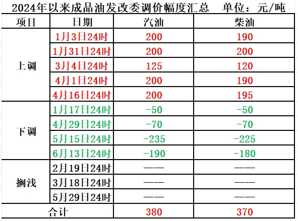 2024年以来,国内成品油零售限价已经历了12次调整,分别为5次上调、4次下调和3次搁浅,涨跌互抵之后,汽油、柴油分别累计上涨380元/吨、370元/吨。