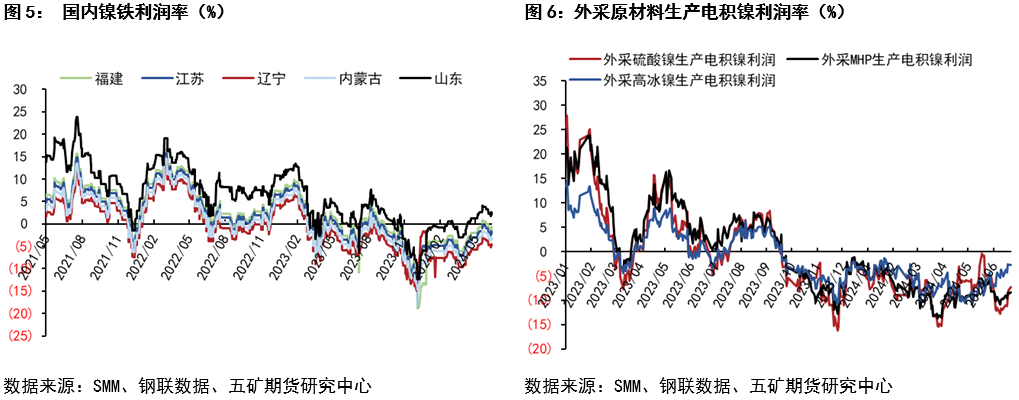 在镍矿价格坚挺背景下,镍产业链整体价格中枢或有支撑。镍铁方面,利润空间正逐步收窄,国内RKEF镍铁厂最低利润率已经到-3.9%,若镍铁价格持续下行,印尼工厂利润也将有逼近成本线的风险。电积镍方面,镍价已经跌破外购原材料生产电积镍企业的成本线,预计在一体化高冰镍生产电积镍成本附近(13万元/吨)有较强成本支撑。
