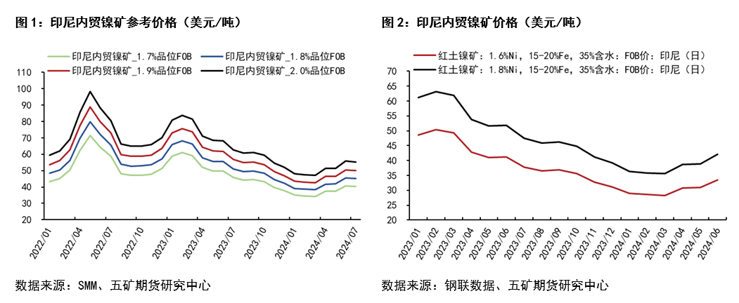 该价格是基于HPM(上月LME现货结算价均价)指数进行计算得到基准价(FOB价),实际内贸价格需根据市场情况加一定升水。2024年以来,印尼镍矿内贸价格基本维持涨势,反映出印尼镍矿现货维持偏紧。