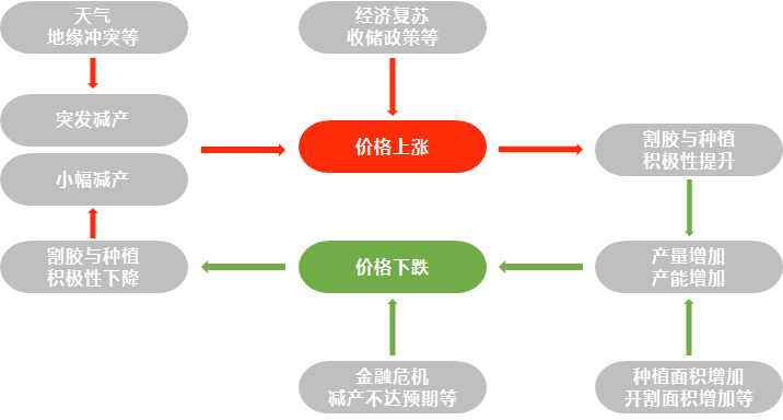 作为具有农业属性的大宗商品,其价格会受到供需结构、经济环境、主要用胶行业的发展情况、天气以及地缘政治等因素的影响。