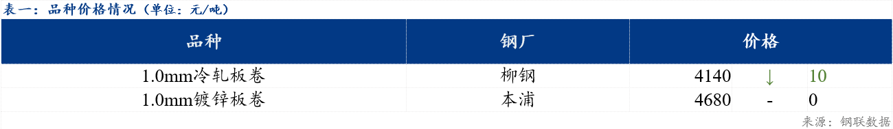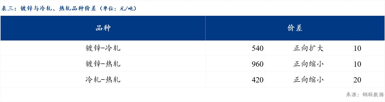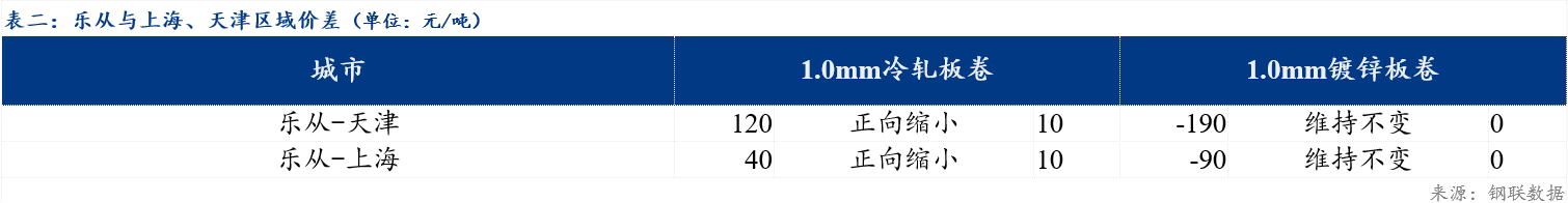 今日冷轧板卷乐从与天津价差较上一交易日收窄10元/吨,乐从与上海价差较上一交易日收窄10元/吨;镀锌板卷乐从与天津价差较上一交易日持平,与上海价差较上一交易日持平。品种价差方面,镀冷价差较上一交易日扩大10元/吨,镀热价差较上一交易日收窄10元/吨,冷热价差较上一交易日收窄20元/吨。