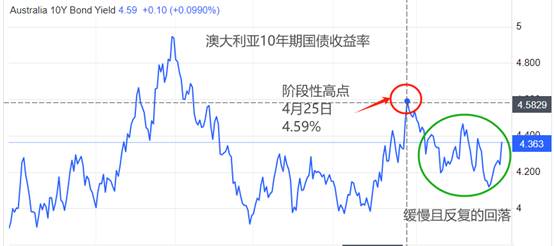 债券市场看。澳大利亚十年期国债收益率在4月份触及阶段性高点4.59%之后,进入缓慢且反复的回调状态。债券利率的下降不坚决,经常出现数周的反弹,意味着债市对于澳洲联储是否会启动首次降息仍没有确定性结论。一年期澳大利亚债券收益率4.48%,澳大利亚基准利率为4.35%,两者相差13个基点,小于25基点的传统降息幅度。据此判断,澳洲联储近期降息的概率不高,这将对澳元币值形成持续性提振。