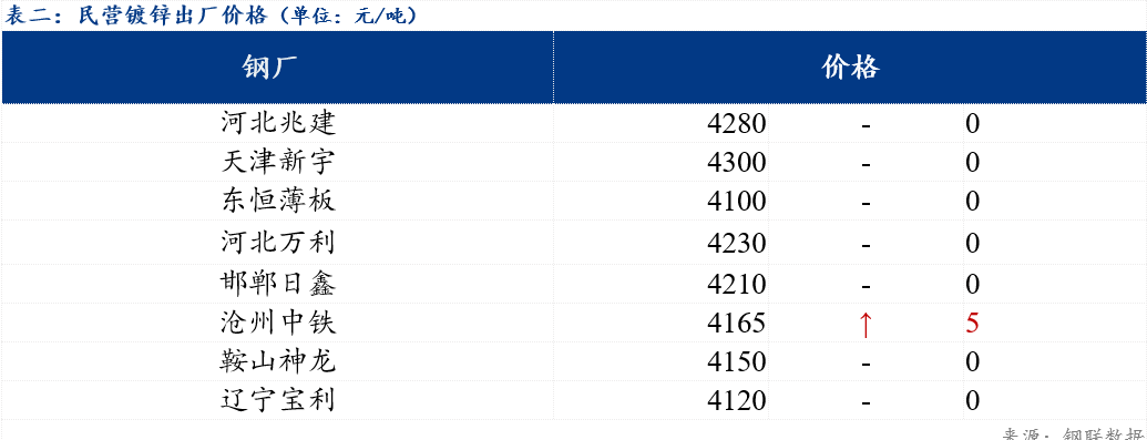 现北方地区民营镀锌板卷整体出厂价格在4120-4300元/吨。