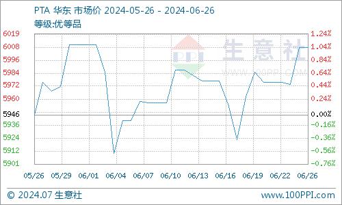据生意社商品行情分析系统,近期国内PTA现货市场行情震荡走强,截止6月26日华东地区PTA市场均价在6008元/吨,较6月18日上涨1.43%。