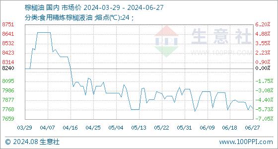 6月27日,生意社棕榈油基准价为7816.00元/吨,与本月初(8008.00元/吨)相比,下降了-2.40%。