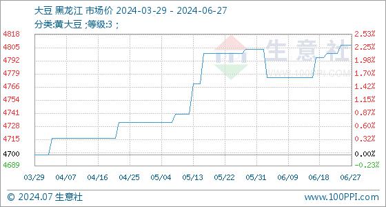 6月27日,生意社大豆基准价为4808.00元/吨,与本月初(4804.00元/吨)相比,上涨了0.08%。