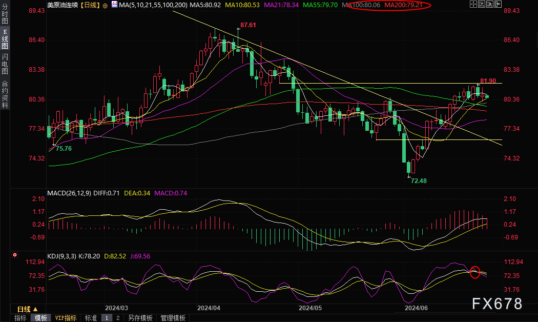 技术面来看,油价顶破200日均线和80关口并没有加速上涨,KDJ形成死叉,K线高位类似“吞没”看空信号后紧跟带上影线的K线,暗示上方卖压较强,投资者需要警惕震荡顶的可能性。下方分别关注100日均线80.06和200日均线79.21附近支撑。