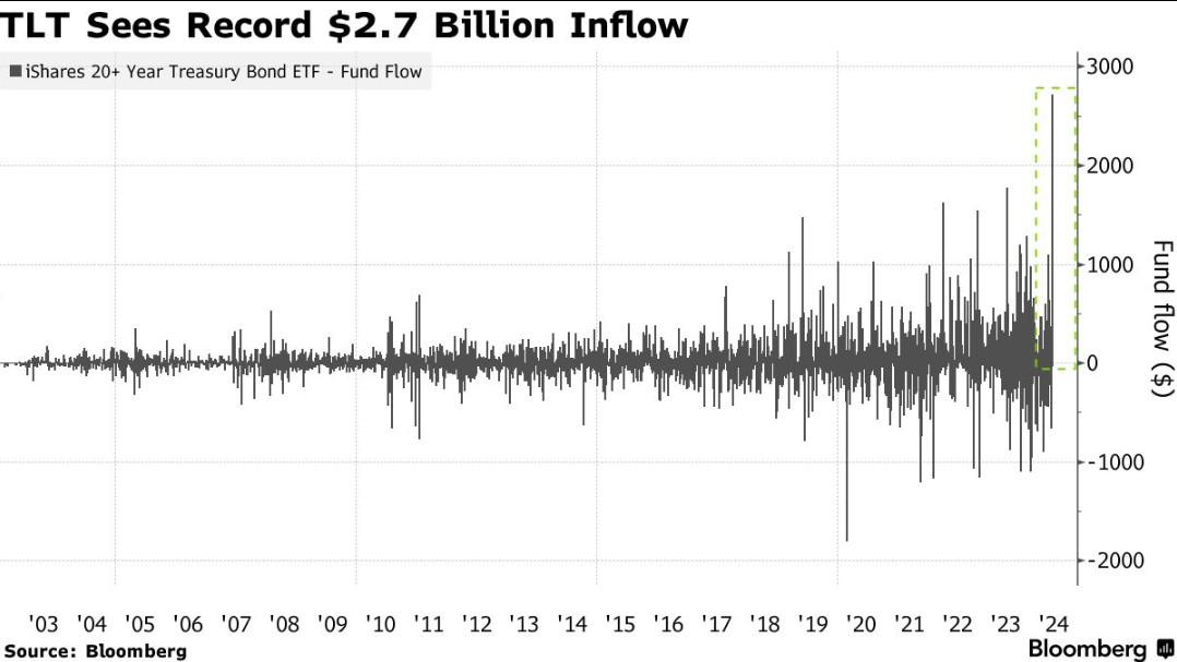 随着市场对美联储今年降息预期的重新评估,投资者纷纷涌向长期债券ETF,寻求避险。本周,贝莱德公司旗下的iShares 20+年期国债ETF迎来了其自2002年成立以来的最大单日资金流入,高达27亿美元。尽管该ETF今年迄今为止下跌了近3%,但其资金流入量已累积至约44亿美元。