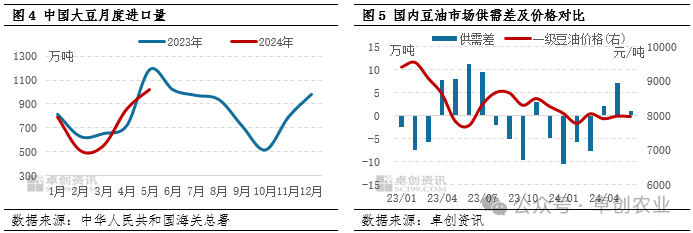 上半年国内豆油市场供应增量有限,供需格局并不完全宽松,制约豆油价格跌幅。根据中华人民共和国海关总署数据,2024年1-5月份,中国累计进口大豆数量3736.99万吨,同比减少5.42%;仅4月的进口量同比增加,其余月份进口量均同比下滑。大豆进口量出现缩减,进入国内压榨企业的大豆有所受限,但因上半年国储大豆不断拍卖,填补了部分大豆缺口,保障了压榨企业原料的整体供应相对充裕,也同样保证了豆油产出。根据卓创资讯跟踪数据,上半年豆油产量约797万吨,同比增2.84%;需求端看,随着经济回暖及餐饮需求带动,上半年豆油消费量约810万吨,同比增6.16%。供需双增,但供应增幅不及预期,供需格局并不完全宽松。
