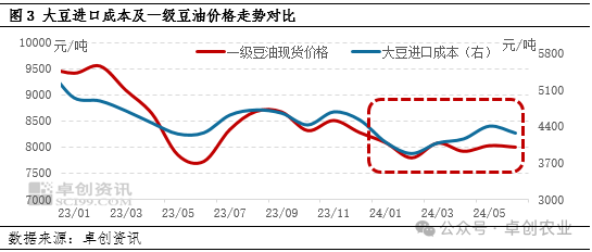 大豆进口成本下降,豆油底部支撑偏弱。大豆进口成本价格由CBOT大豆期价主导,国际大豆丰产预期及产区天气升水的多空博弈下,2024年上半年CBOT大豆期价带动大豆到港成本先跌后涨,重心同比下移。根据卓创资讯跟踪数据显示,年初至今大豆进口成本与豆油现货价格关联度达86%,受基本面等其他因素制约,两者间波动幅度有所差异。截至24日,上半年大豆进口成本均价4150元/吨,同比跌9.49%,较豆油现货跌幅略大1.31个百分点。上半年大豆进口成本重心下移且反复震荡,是导致上半年豆油价格低位盘整的重要因素。