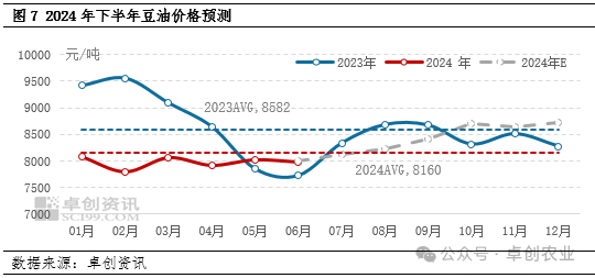 综上所述,上半年供需宽松格局不明显,同时宏观及相关油脂托底,国内豆油行情低位盘整。下半年豆油需求增幅预期超供应增幅,同时考虑到宏观利多氛围及相关植物油的扶持,或共同导致豆油行情走高。预计下半年国内豆油行情或继续向上修复,一级豆油均价的波动区间为7800-8800元/吨,整体强于上半年,与《2023-2024中国豆油市场年度报告》中预测趋势基本一致。