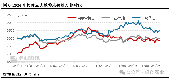 除了成本及供需面外,国内豆油价格会受到宏观及相关油脂价格的扰动。因国际市场中,豆油、棕榈油及菜籽油为生物柴油的主要掺混原料。由于金融属性较强的原油与生物柴油相互替代,三大植物油及原油间的价格联动性较强,也因此导致豆油市场易受到宏观及相关油脂的影响。上半年看,一季度地缘局势及美联储降息预期驱动下,原油期价领涨国内外植物油市场,叠加产地产量及库存缩减,棕榈油价格一季度上涨趋势明显,3月24度棕榈油价格环比增幅超8%。二季度初随着美国经济增速放缓,通胀预期下调,导致市场对美联储降息预期不断推后,叠加地缘风险溢价的回吐,国内外油脂期价滞涨回落。5月前后正处于播种及生长期的菜籽及大豆产区极端天气扰动,油籽期价上涨自成本端带动豆油及菜籽油止跌反弹,同时加拿大农业部调降菜籽产量助推下,国内菜籽油价格不断趋强。截至6月26日,三级菜籽油全国均价8426元/吨,24度棕榈油均价7795元/吨,较2023年末分别涨3.55%和8.29%,三大植物油拖拽前行。