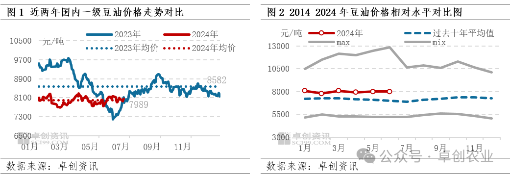 上半年国内豆油行情整体重心同比下移,呈震荡盘整局势,与《2023-2024中国豆油市场年度报告》中预测的基本一致,但因年内供应端增量不及预期,供需格局并不完全宽松,阶段内跌幅小于预期。截止到6月26日,一级豆油全国均价为7865元/吨,较2023年末下跌3.71%;从相对水平来看,上半年一级豆油全国均价7989元/吨,较2023上半年下跌8.12%;从长周期运行趋势看,2024年上半年豆油价格整体位于十年均值偏上方位置震荡,并处于继2023年价格高位回落后企稳震荡阶段。