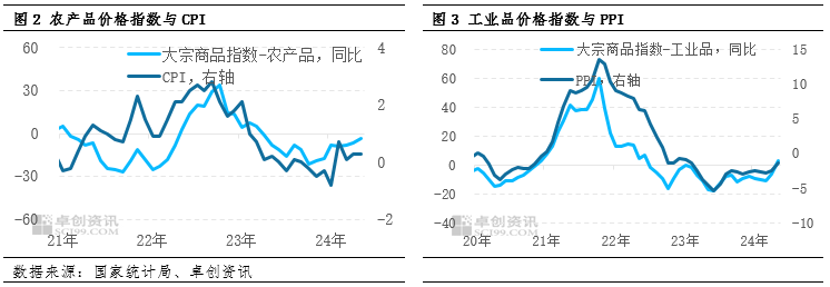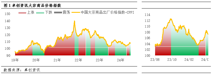 以卓创资讯大宗商品出厂价格指数为例,6月20日该指数收报107.38点,工业品指数为108.53点,农产品指数104.78点,分别较2023年末分别下跌2.28、5.19和上涨4.35点,相比较于2023年6月末价格分别上涨3.78、4.79%和2.45%。