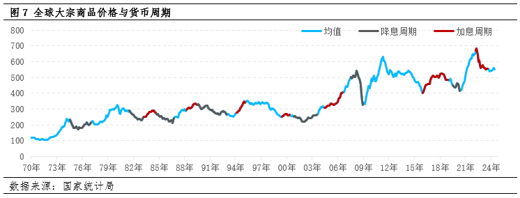 降息从理论上讲,是放水的行为,目的是缓解市场流动性紧张问题。但从实证研究角度看,大宗商品价格在降息周期中并非是一直上涨的。以全球大宗商品价格指数为例,我们观察下上世纪79年代以来美联储7次降息周期期间,价格总体上呈回落状态,降息周期末端一般会迎来价格的上涨,1974年7月至1977年1月期间和2000年11月到2003年7月两个降息周期中,商品价格开始上涨的分位数分别位于两个阶段40%和41%位置。1981年7月-1983年2月、1984年8月-1986年10月两个加息周期中价格均从加息周期结束前的第三个月开始见底上涨,2007年7与-2008年12月、2019年7月-2020年4月这一阶段价格均是降息周期结束之后方才进入上行过程。