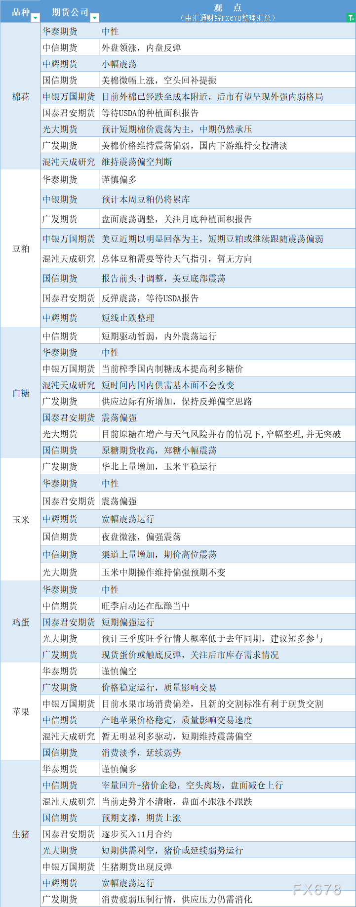 汇通财经APP讯——期货公司观点汇总一张图:6月27日农产品(棉花、豆粕、白糖、玉米、鸡蛋、生猪等)