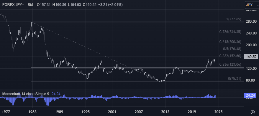 从技术分析的角度来看,美元/日元的上行趋势似乎并未结束。技术图表显示,美元/日元在4月突破了费波纳奇技术位152.60,这一位置是1982年至2011年跌幅的38.2%回撤位。14周动能研究不断显现积极势头,为美元/日元提供了支撑。如果这一趋势得以延续,美元/日元有望进一步扩大涨幅,甚至突破165、170的心理关口,测试50%费波纳奇技术位176.48。