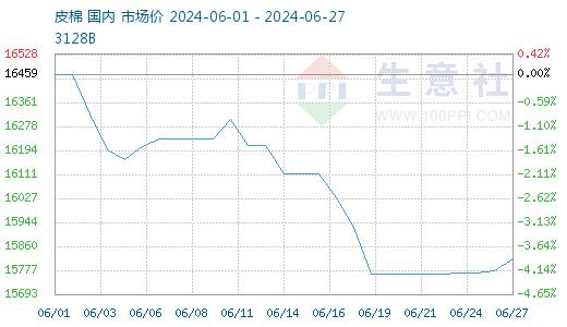 6月以来,国内棉价大幅下跌,步入行业淡季,下游棉花消费速度有所放缓,市场供需宽松背景下,棉价承压。至月底,内外棉价低位徘徊后,在美棉上涨拉动下,行情止跌回稳。据生意社商品行情分析系统,6月27日3128B级皮棉现货价格在15818元/吨,较月初下跌3.89%。