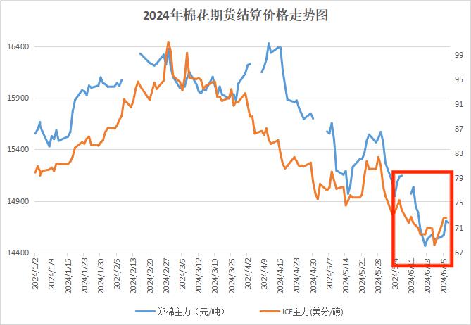 棉价持续下跌主要原因是:一方面6月来下游纺织市场淡季氛围更加浓厚,纺企产销阻滞影响对皮棉的采购,同时供应端新疆和内地的旱情整体有所缓解,市场供需宽松情况持续;另一方面是在前期棉价破位下跌后,市场情绪悲观,继续惯性回落;同时外盘长期下探至低位,内外棉维持较大价差也令郑棉承压。
