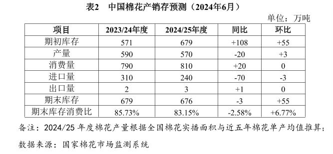 6月以来,国内纺织市场淡季氛围浓重。截至6月20日,全国新棉销售率为82.4%,同比下降13.3个百分点。本月国家棉花市场监测系统将2023/24年度棉花消费量调减10万吨至790万吨,2023/24年度期末库存和2024/25年度期初库存调增55万吨至679万吨。