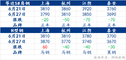 据Mysteel调研数据来看,截止6月27日,上海5#角钢价格3790元/吨,周环比下跌20元/吨,H型钢200*200价格3870元/吨,周环比上涨60元/吨;杭州5#角钢价格3810元/吨,周环比下跌50元/吨,H型钢200*200价格3770元/吨,周环比下跌40元/吨;江阴5#角钢价格3850元/吨,周环比下跌70元/吨,H型钢200*200价格3740元/吨,周环比下跌40元/吨;泰安5#角钢价格3690元/吨,周环比下跌70元/吨,H型钢200*200价格3670元/吨,周环比下跌30元/吨。