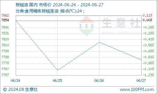 据生意社商品行情分析系统显示:6月末,棕榈油行情振荡下跌。6月24日,棕榈油市场均价7854元/吨,6月27日棕榈油市场均价7784元/吨,价格下跌0.89%。