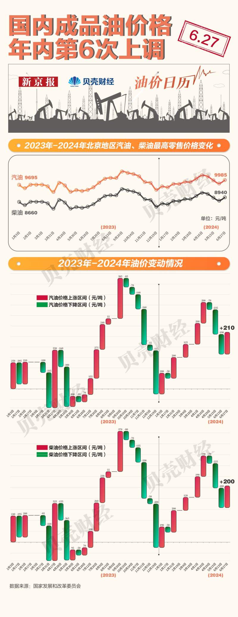 据国家发改委消息,自6月27日24时起,国内汽、柴油零售限价分别上调210元/吨和200元/吨。折合成升价,每升92号汽油、95号汽油及0号柴油分别上调0.16元、0.17元、0.17元。北京地区汽油最高零售价为9985元/吨,柴油为8940元/吨。