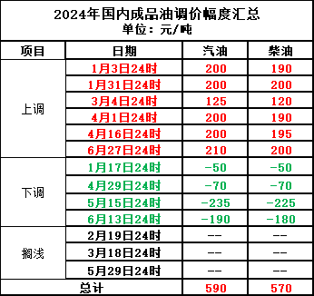 本轮上调落实后,上半年成品油零售限价共历经13次调价窗口,为6次上调,4次下调,3次搁浅。标准汽、柴油累计上调590元/吨、570元/吨,折合升价后92#汽油、95#汽油、0#柴油分别上调0.46元、0.49元、0.48元。