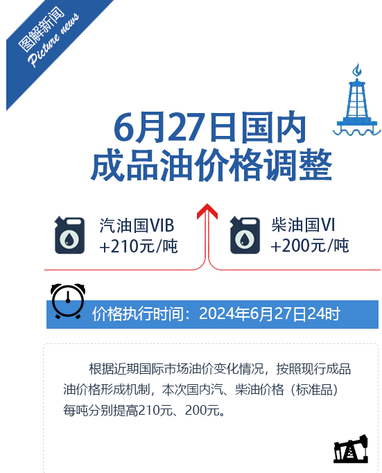 6月27日,国家发改委官方消息显示,根据近期国际市场油价变化情况,按照现行成品油价格形成机制,自2024年6月27日24时起,国内汽、柴油价格每吨分别上调210元、200元。