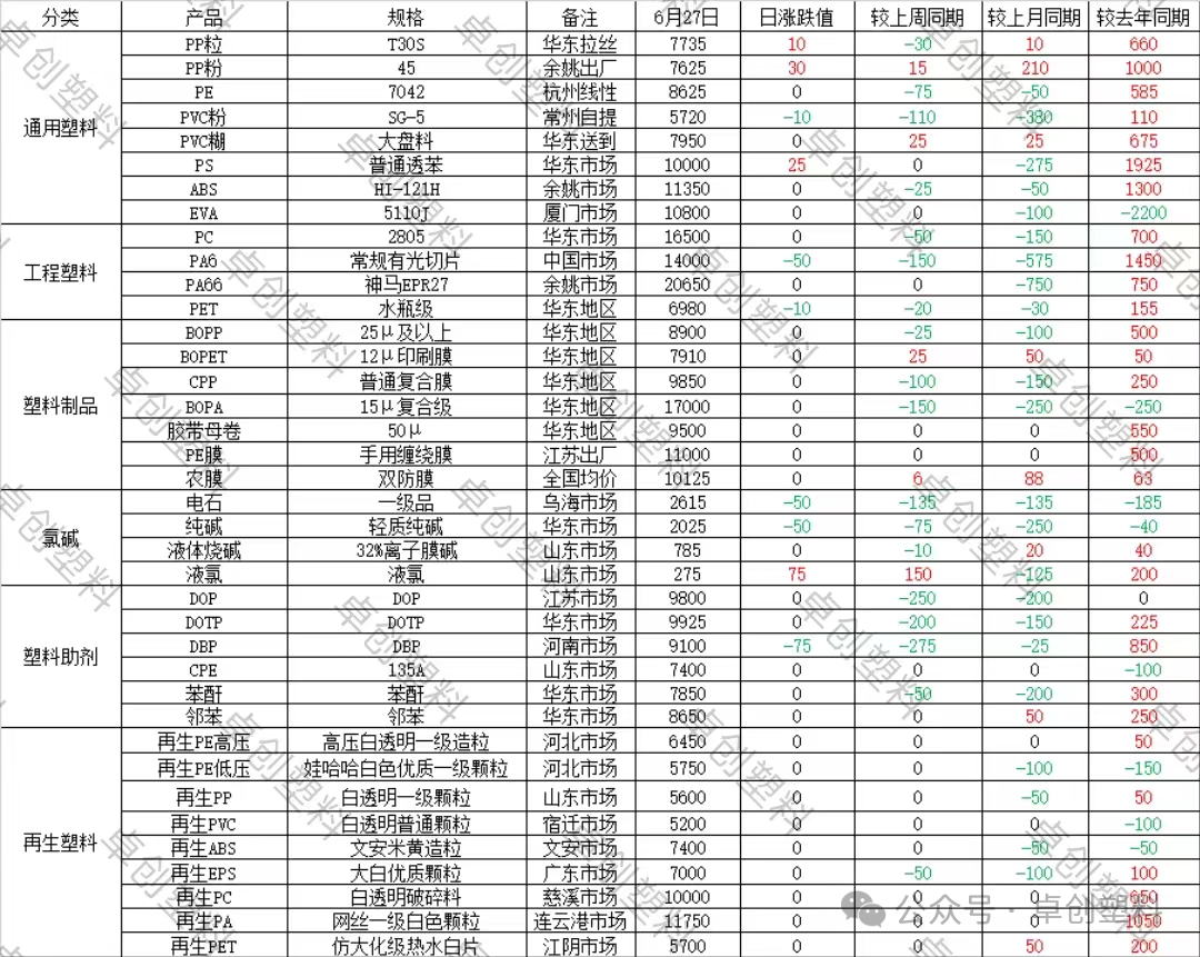 本周再生PVC市场低迷盘整,场内实单交投疲软。截至6月27日收盘,河北白塑钢国标水洗破碎料价格为3300-3400元/吨,较上周均价持平,较去年同月均价下跌279元/吨;江苏白透明普通颗粒5200元/吨,较上周均价持平,较去年同月均价下跌133元/吨。本周再生PVC市场弱势僵持观望。目前毛料价格持坚,再生厂家生产积极性不高,下游需求端表现持续疲软,厂家询盘及补仓积极性难提;场内现货库存高位延续,部分开工仅为维持工人。市场整体供过于求,基本面矛盾较突出。