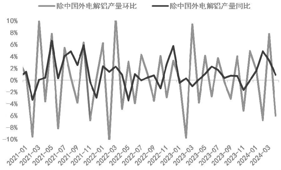 自2022年年末,电解铝的建成产能基本稳定在4500万吨附近,这源于2018年我国对电解铝进行的供给侧结构性改革,政策要求电解铝产能只能在4500万吨附近进行等量或减量置换,不再批准无指标的新建产能。在供应受到严格限制的情况下,价格长期来说将保持强势。同时,我国是全球最大的电解铝生产国,海外产量的波动主要受到我国产量的影响,海外产量增速基本保持在零值附近。再考虑到进口窗口关闭,因而除了受到制裁不得不低价流入我国的俄铝外,海外目前没有额外的资源对我国进行补充。