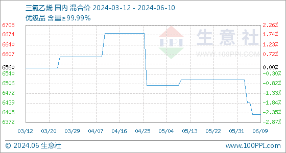 6月10日生意社三氯乙烯基准价为6400.00元/吨