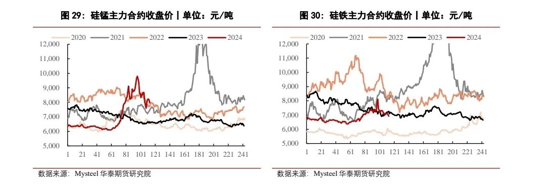硅铁方面,昨日硅铁期货价格震荡下跌,硅铁2409合约收于6884元/吨,较上个交易日上涨12元/吨,涨幅0.17%。现货方面,主产区72硅铁自然块现金含税出厂6700-6750元/吨,75硅铁自然块7100-7300元/吨。供应端,高利润下硅铁产量持续增加,原料兰炭价格偏稳运行,对成本有所支撑,但需求端来看,钢厂复产已接近尾声,消费淡季到来,使得硅铁需求预期转弱。整体来看,硅铁基本面情况变化不大,多空博弈下预计短期价格维持震荡运行,后续需关注钢厂采购及硅铁去库速率的变化情况。