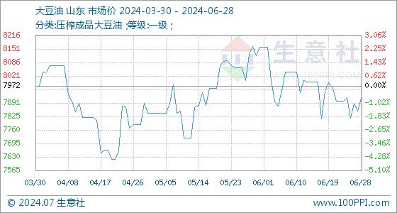 6月28日,生意社大豆油基准价为7852.00元/吨,与本月初(8160.00元/吨)相比,下降了-3.77%。