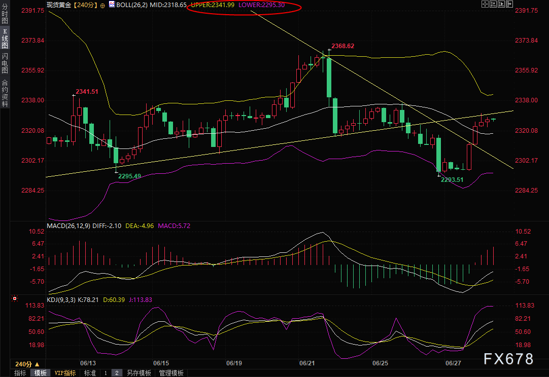 隔夜金价大幅反弹后,大幅增加了后市走势的不确定性,从4小时级别来看,布林线收口后接近水平运行,鉴于留意布林线轨道2295.30-2342.01区域突破情况。