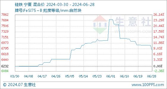 6月28日,生意社硅铁基准价为6907.14元/吨,与本月初(7714.29元/吨)相比,下降了-10.46%。