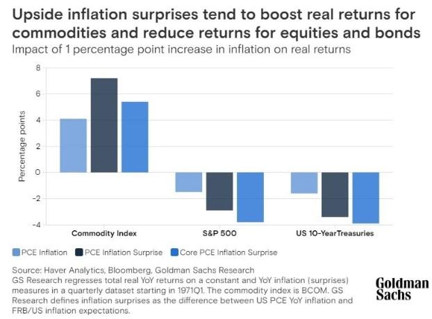 该报告的作者、石油研究主管Daan Struyven和分析师Lina Thomas发现,“美国通胀意外上升1%,平均会导致大宗商品的实际(经通胀调整后的)回报率上升7%,而同样的触发因素会引起股票和债券分别下跌3%和4%。”