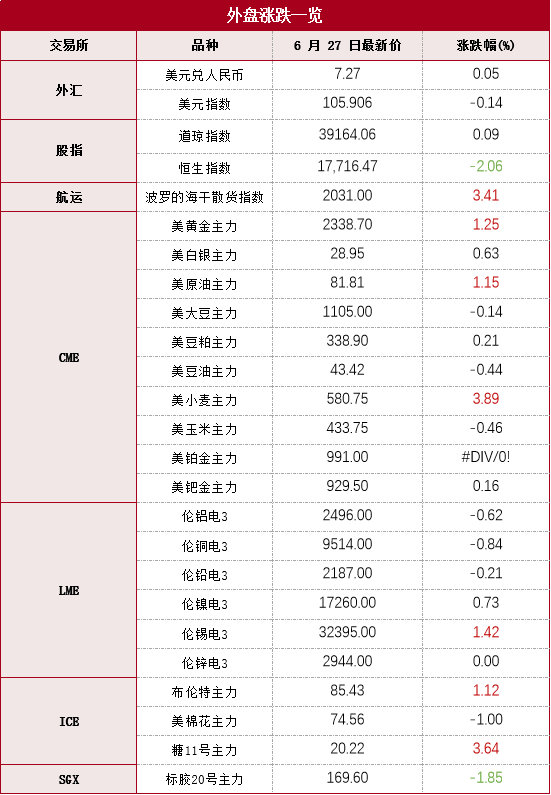 隔夜,LME铜收跌81美元,跌幅0.84%,LME铝收跌15美元,跌幅0.62%,LME锌收平,LME镍收涨125美元,涨幅0.73%,LME锡收涨455美元,涨幅1.42%,LME铅收跌4美元,跌幅0.21%。消息面:美国上周初请失业金人数为23.3万人,预期23.6万人。美国第一季度核心PCE物价指数年化终值环比升3.7%,预期升3.6。欧元区6月制造业PMI初值45.6,为6个月以来新低,预期47.9。Antofagasta与中国冶炼厂就2025年50%的铜精矿供应量的长单TC/RC敲定为23.25美元/干吨及2.325美分/磅。据SMM调研,上周国内主要大中型铜杆企业综合开工率为70.15%,较前周环比上升5.41个百分点。5月份国内铝线缆行业综合开工率环比4月下降0.38%至53.88%,同比去年上涨6.12个百分点 。最新全国主流地区铜库存增1.25万吨至39.91万吨,国内电解铝社会库存增0.2万吨至76.3万吨,铝棒库存减0.7万吨至14.35万吨,七地锌库存增0.08万吨至19.46万吨。金属库存小幅回落,欧洲率先降息,美元震荡。操作建议,短线偏空交易思路为主,买氧化铝卖电解铝套利持有。观点仅供参考。