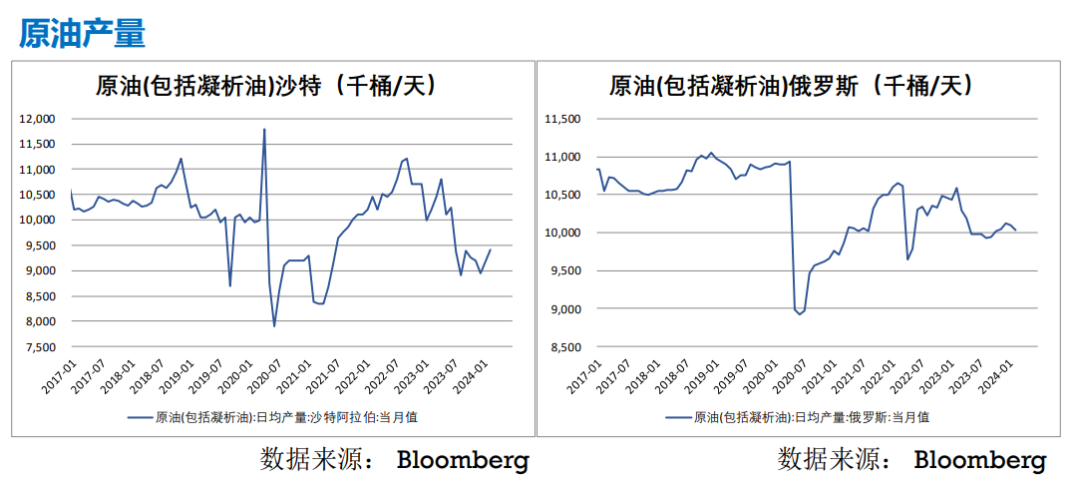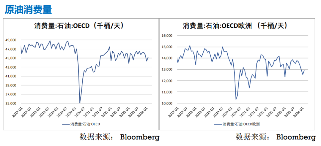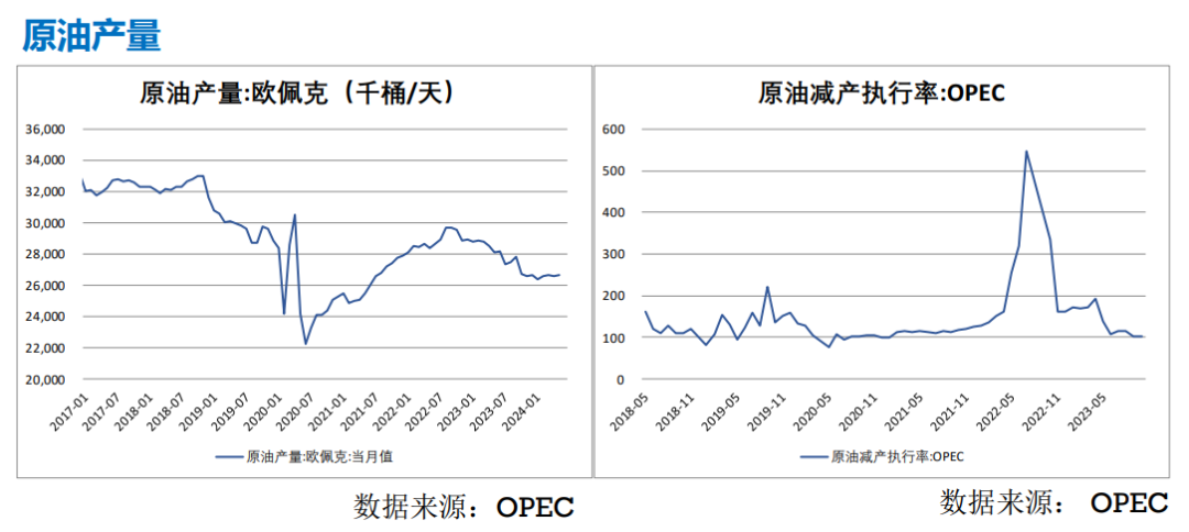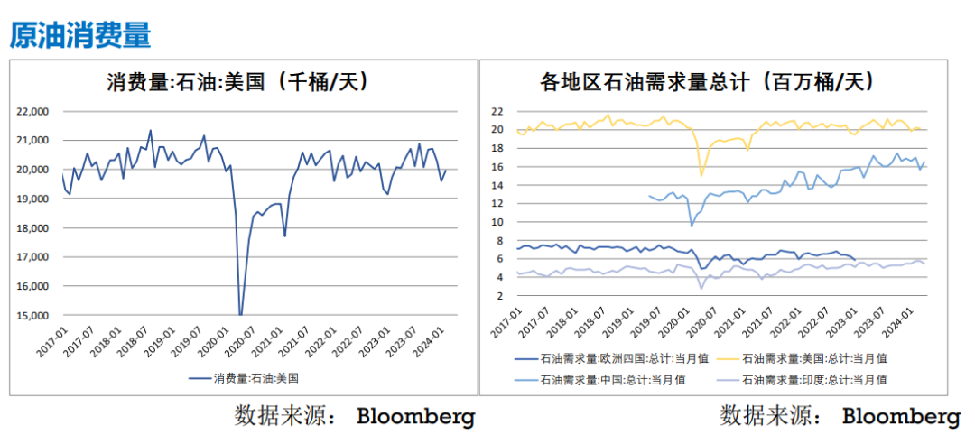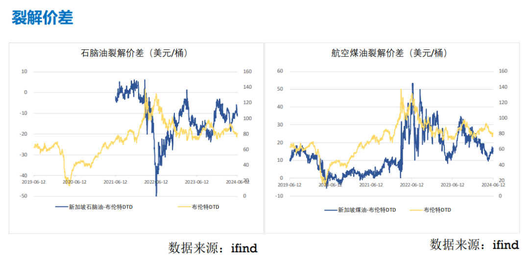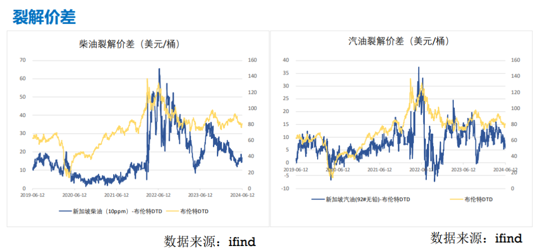 需求 | 偏空 | 夏季是出行旺季,当前汽油去库趋势较好,需求有所提振 IEA月报:石油需求增长将由亚洲经济体主导,尤其是印度的公路运输和中国的航空燃料和石化产品。 全球石油需求将在2029年达到峰值,为每日1.056亿桶,并在2030年略微收缩。 到2030年,发达经济体的石油需求将从2023年的近4600万桶/日降至不到4300万桶/日。 将2024年石油需求增长预测下调10万桶/日至96万桶/日。鉴于经济低迷和清洁能源技术的部署,到2025年石油需求增长将达到每日100万桶。 欧佩克月报:将2024年和2025年全球原油需求增速预期分别维持在225万桶/日和185万桶/日不变。 | |