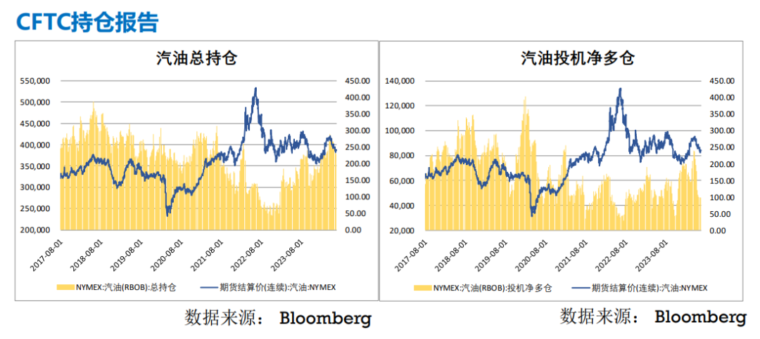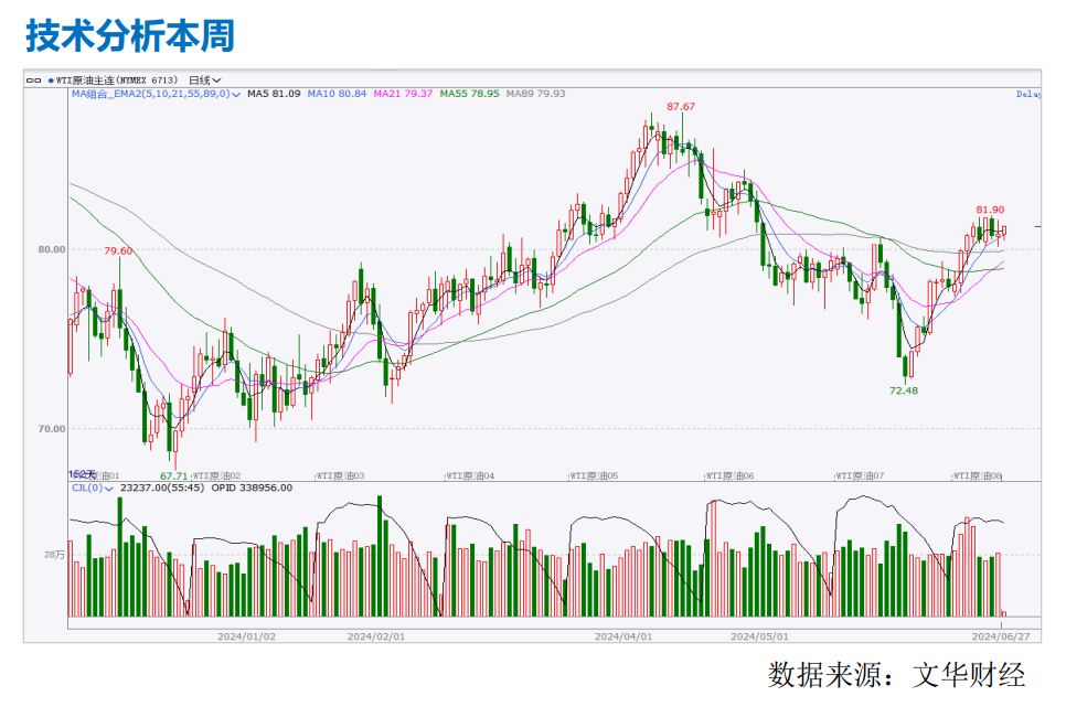 | 技术面 | 量仓 | 偏空 | 6/18日当周WTI原油投机净多仓较上周下行,汽油投机净多仓较上周下行。 |