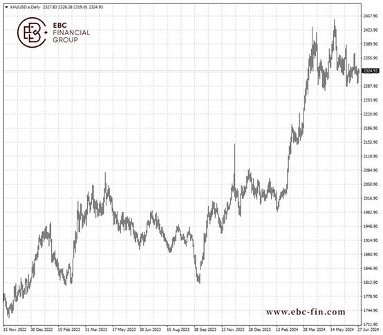 黄金2300美元的关键心理支撑位依然牢固,初始阻力位于2350美元左右,突破该位置可能走向本月最高点。