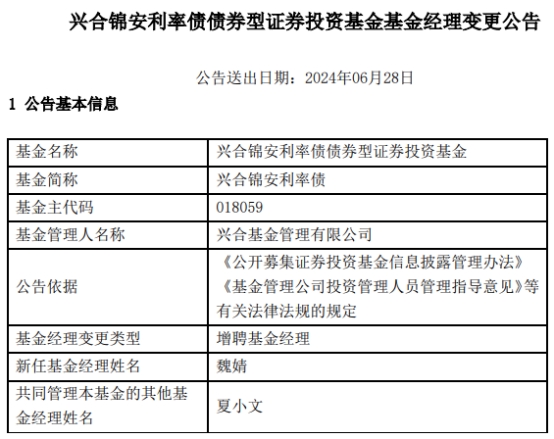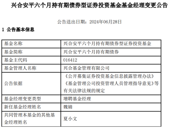 中国经济网北京6月28日讯今日,兴合基金管理有限公司公告称,兴合安平六个月持有期债券(A类016412;C类016413)、兴合锦安利率债(A类018059;C类018060)增聘基金经理魏婧。