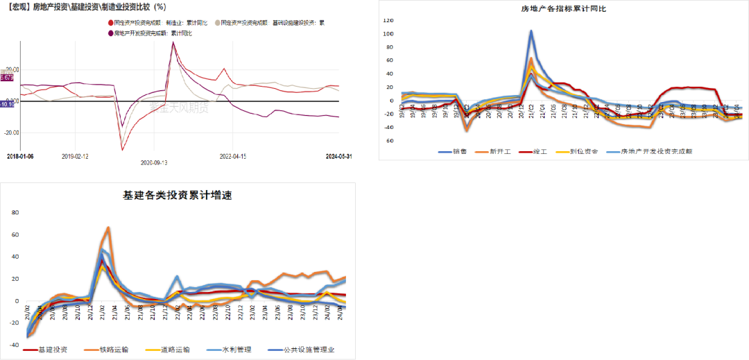 1-5月基建投资增速5.7%,高于去年全年5.9%,但低于去年同比增速7.5%,年初增长势头有所放缓。主要增速仍集中在铁路和水利管理领域。中央统筹的重大项目建设有着较高增速,地方政府受12+19省份化债政策影响,投资项目管理较严格,加之部分专项债存在“借新还旧”情况,实物工作量转化率降低,全年基建累计同比或有下降。