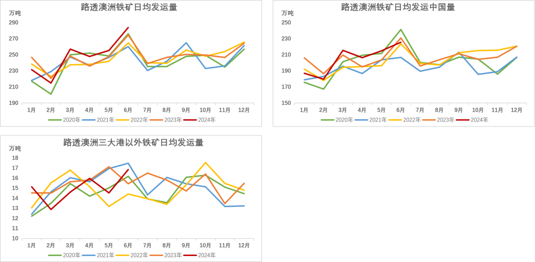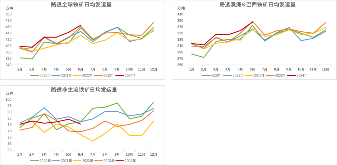 从路透发运数据来看,2024年上半年全球发运增量明显。截止2024年6月20日(本文数据均截止至此日期),上半年全球日均发运量为426万吨/日,同比415万吨/日增2.6%。其中主流国家总发运量为近五年最高值,非主流地区发运较22-23年有所回升,但较20-21年仍有减量。
