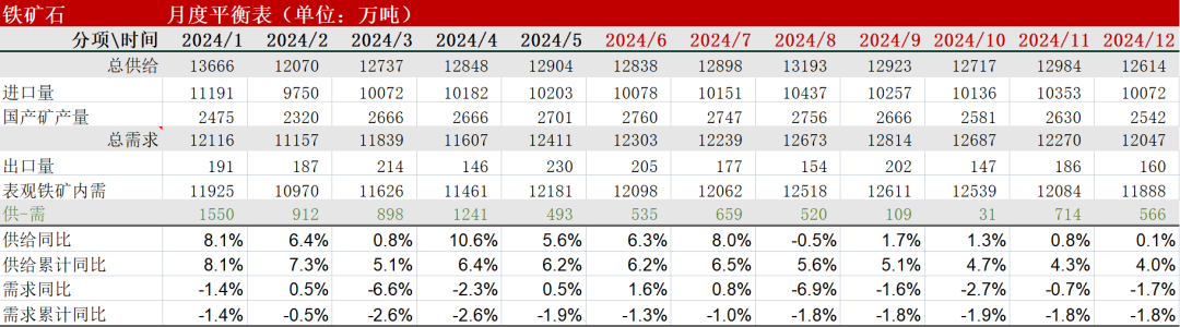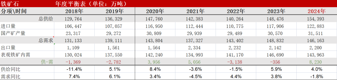 需求端:铁水产量9.0亿吨,系数1.6折算,铁矿需求量14.40亿吨,同比减2700万吨(-1.9%);出口2200万吨,同比持平;总需求14.62亿吨,同比减2700万吨(-1.8%)。