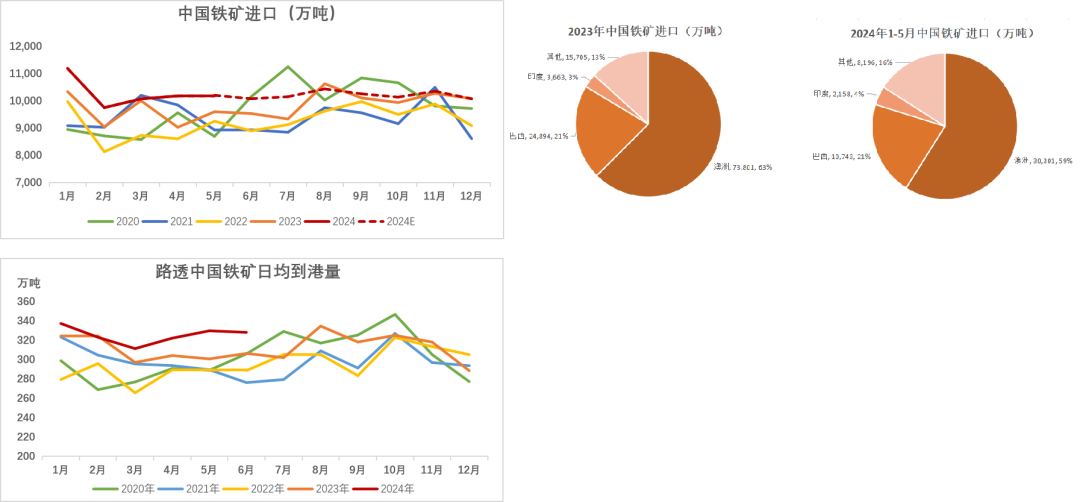 下半年预计巴西矿进口量同比持平,增量出现在澳矿及非主流矿,我们将全年进口量上调1000万吨至5000万吨,24年预计进口量约12.3亿吨。