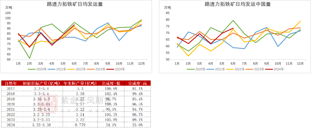 24财年前三季度FMG目标下限完成度71.8%,同比23财年前三季度76.5%的完成度减少4.7%;当季度同比去年下降6%,减量主要原因为23年12月底铁路脱轨事件以及一季度2场飓风影响港口发运。目前FMG运营回复迅速,24年3月份破历史同期最高产量记录。财年目标暂未下调,官方预计将完成目标下限,从目前发运情况推测财年下限能够达成。
