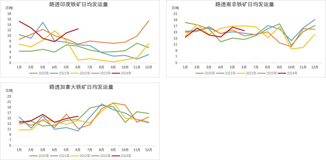 上半年加拿大日均发运15万吨/日,同比13万吨/日增10%,目前未受到山火影响,且IOC系统设备得到提升,发运表现较好。南非日均发运14.9万吨,同比15.2万吨/日降1.9%,Kumba矿铁路3月份出现脱轨,对发运有一定影响,修复后发运回补。