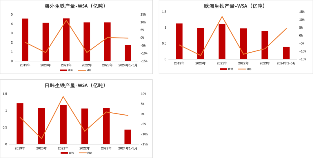 24年1-5月海外生铁产量1.73亿吨,同比微降0.2%,增速基本与23年持平,海外主要地区中欧洲1-5月生铁产量3900万吨,同比增1300万吨或4.4%,日韩两国生铁4300万吨,同比微降0.7%,其中韩国减300万吨,日本减700万吨。